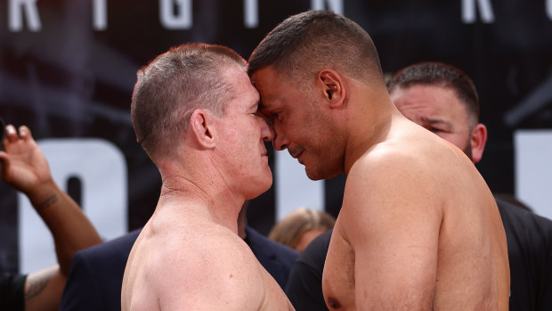 Paul Gallen and Justin Hodges get up close and very personal at Wednesday’s weigh in.Credit:Getty