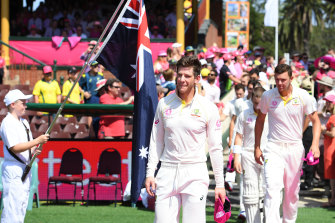 Tim Paine leads the Australian team onto the field during the SCG Test against India in January 2019.Credit:AAP