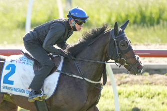Craig Williams jumps aboard Spanish Mission at Werribee on Sunday.Credit:Getty Images