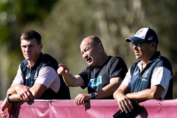 Wallabies coach Eddie Jones watches Queensland training with Berrick Barnes and David Rath.Credit: Getty Images