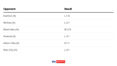 - Chelsea have suffered as many defeats in their last six Premier League games (W1 D1 L4) as they did in the 23 matches beforehand (W14 D5 L4).