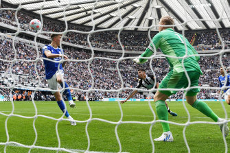 Bruno Guimaraes scores the winning goal for Newcastle against Leicester at St James Park on Sunday.Credit:Getty Images