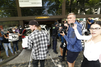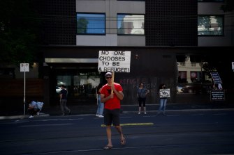 Refugee advocates outside Park Hotel in Melbourne after Novak Djokovic was driven into the underground car park of the Carlton building by officers on Saturday afternoon.Credit:Marta Pascual Juanola